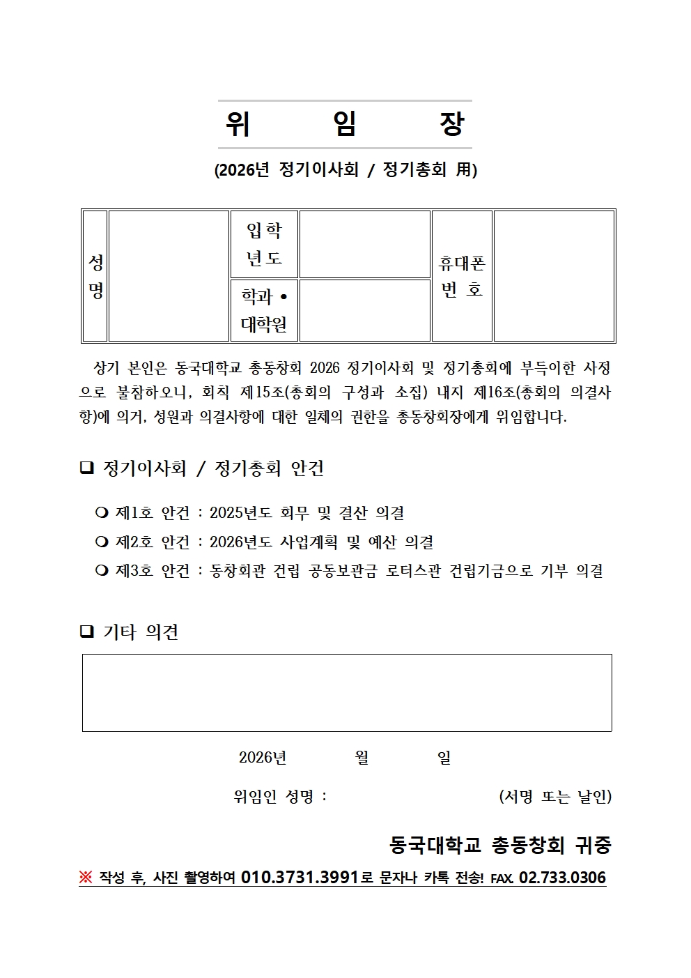 참석이 어려운 분들께서는 상기 위임장 양식은 아래 첨부파일을 다운받아 작성하시고 팩스 또는 사진을 촬영하여 문자로 보내주시기 바랍니다.