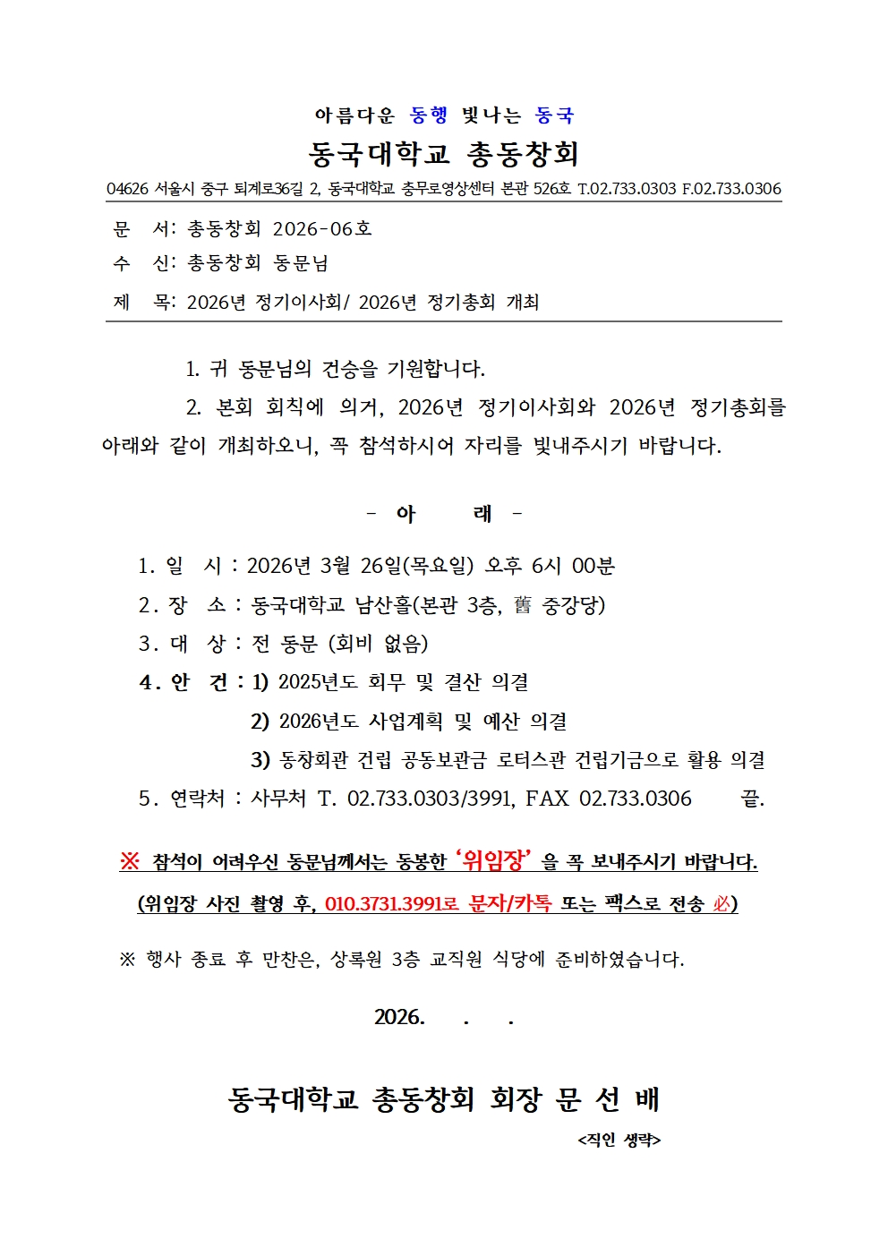 총동창회 회칙 제15조(총회의 구성과 소집) 및 제16조(총회의 의결사항)에 의거, 다음과 같이 2026년도 정기총회를 개최하오니 회원님들의 참석을 바랍니다.